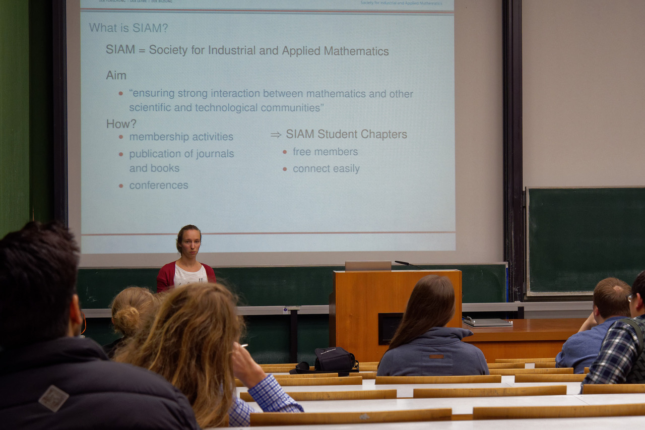 enefits of professional organisations and SIAM in particular. Sören Schwenker, our representative at the SIAM Annual Meeting 2017 in Pittsburgh, Pennsylvania, showed us some impressions from the meeting. Overall, the advantages of joining our SIAM student chapter were presented from multiple perspectives.